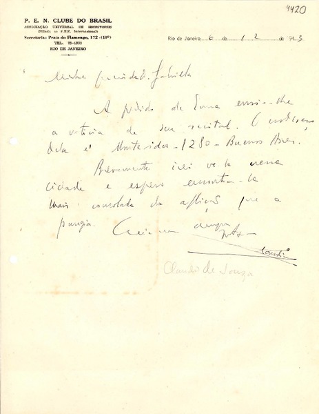 [Carta] 1943 dic. 6, Río de Janeiro [a] Gabriela Mistral [manuscrito] Claudio de Souza.