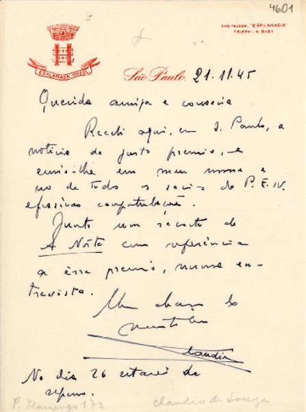 [Carta] 1945 nov. 21, São Paulo, [Brasil] [a] [Gabriela Mistral] [manuscrito] [Claudio de Souza].