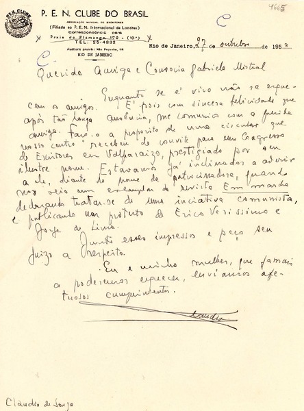 [Carta] 1952 oct. 27, Río de Janeiro [a] Gabriela Mistral [manuscrito] Claudio de Souza.