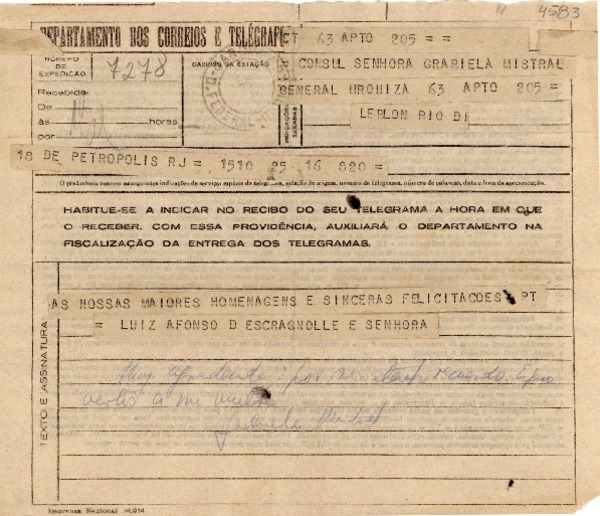 [Telegrama] 1945 nov. 16, Petrópolis, Brasil [a] Gabriela Mistral [manuscrito] Luiz Alfonso Escragnolle y Sra.