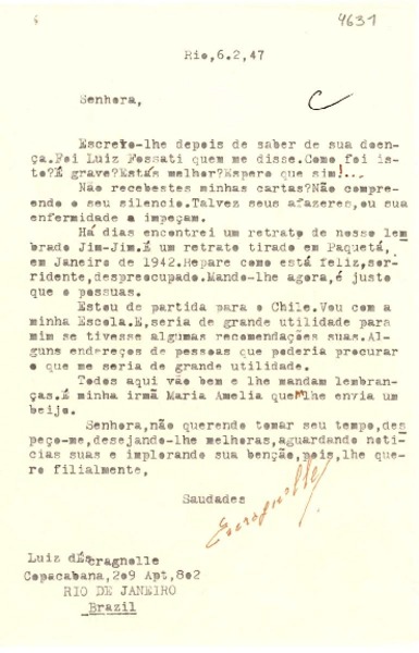 [Carta] 1947 feb. 6, Río [de Janeiro] [a] Gabriela Mistral [manuscrito] Luiz Escragnolle.
