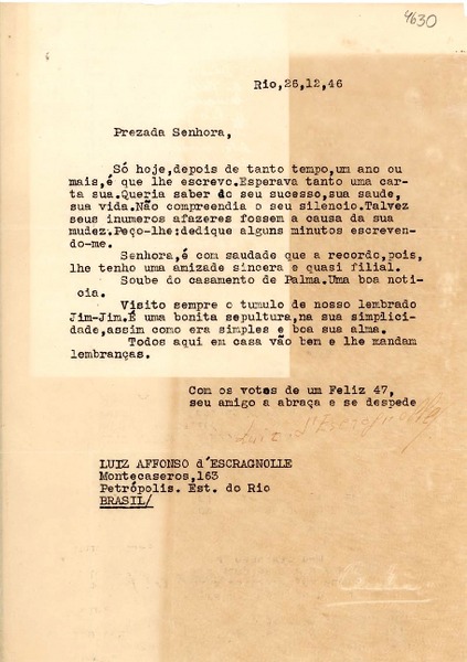 [Carta] 1946 dic. 26, Rio de Janeiro, Brasil [a] [Gabriela Mistral] [manuscrito] Luiz Alfonso d'Escragnolle.