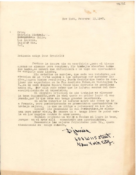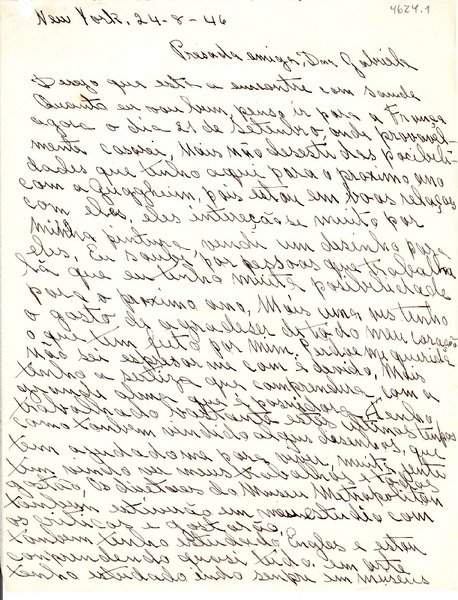[Carta] 1946 ago. 24, New York [a] Gabriela [Mistral] [manuscrito] Djarmira [G. Pereira].