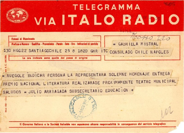 [Carta] [1952], Santiago, Chile [a] Gabriela Mistral [manuscrito] Julio Arriagada Herrera.