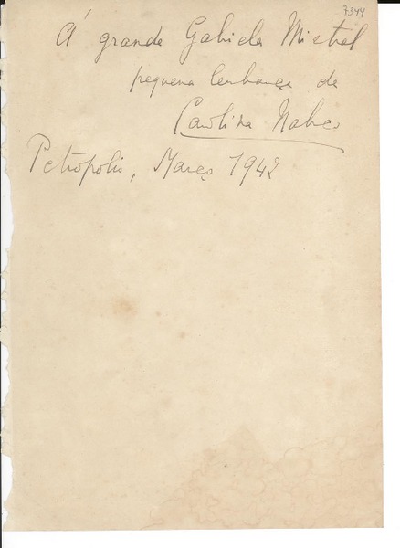 [Carta] 1942 mar., Petrópolis, [Brasil] [a] Gabriela Mistral [manuscrito] Carolina Nabuco.
