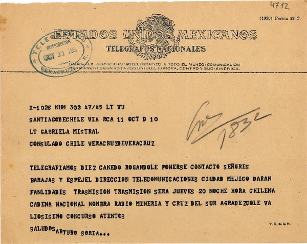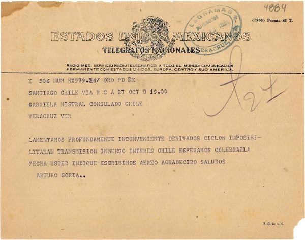 [Telegrama] 1950 oct. 11, Santiago, Chile [a] Gabriela Mistral, Consulado de Chile, Veracruz [manuscrito] Arturo Soria.