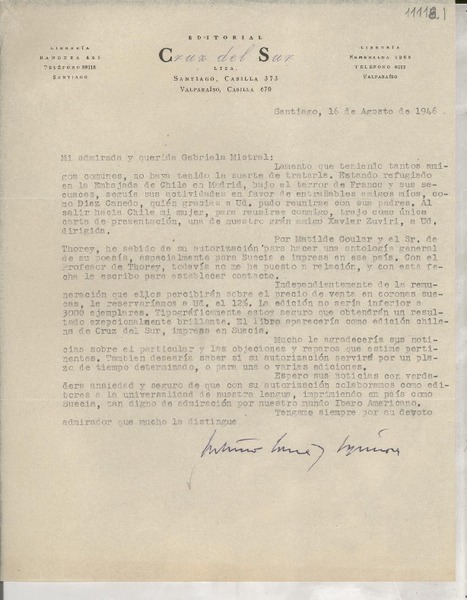 [Carta] 1946 ago. 16, Santiago, [Chile] [a] Gabriela Mistral