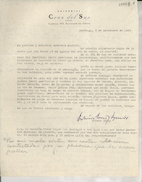 [Carta] 1946 nov. 6, Santiago, [Chile] [a] Gabriela Mistral [manuscrito] Arturo Soria.