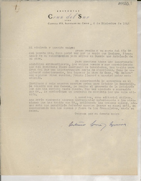 [Carta] 1946 dic. 6, Santiago, [Chile] [a] [Gabriela Mistral] [manuscrito] Arturo Soria.