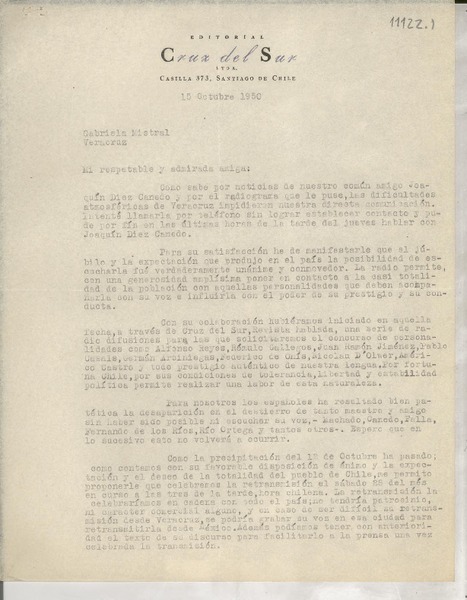 [Carta] 1950 oct. 15, Santiago, [Chile] [a] Gabriela Mistral, Veracruz, [México]