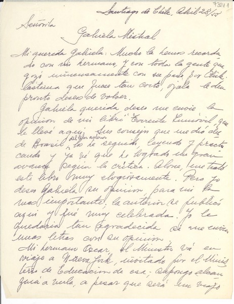 [Carta] 1955 abr. 28, Santiago, Chile [a] Gabriela Mistral [manuscrito] Patricia Morgan.