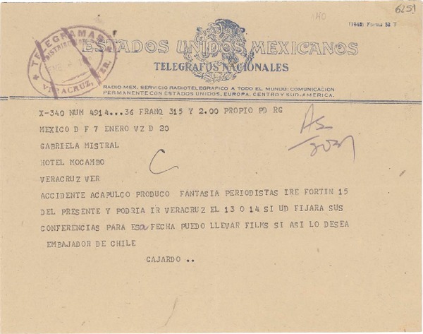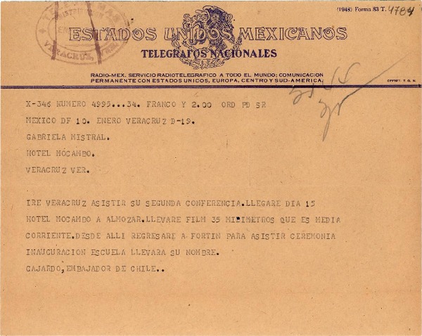 [Telegrama] 1949 ene. 7, México D.F. [a] Gabriela Mistral, Veracruz [manuscrito] Gajardo.