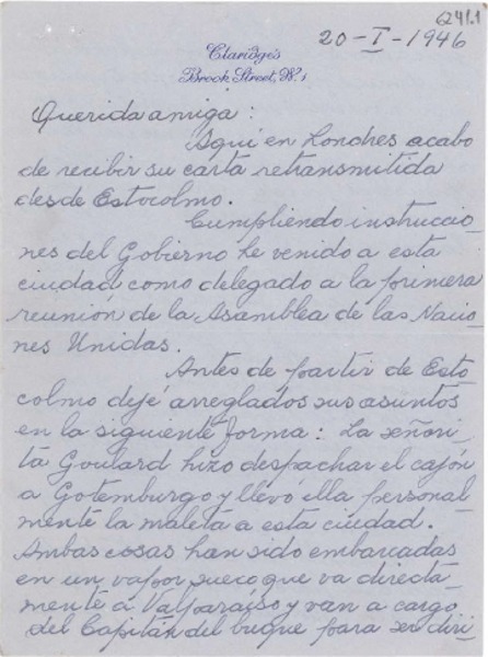 [Carta] 1946 ene. 20, Londres [a] Gabriela Mistral [manuscrito] E. Gajardo.