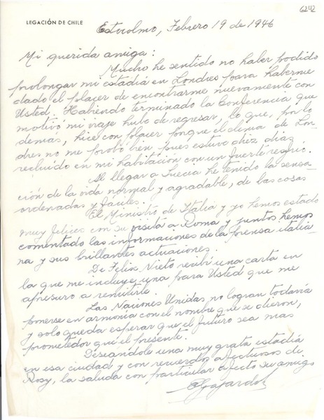 [Carta] 1946 feb. 19, Estocolmo [a] Gabriela Mistral [manuscrito] E. Gajardo.