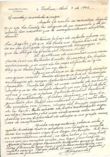 [Carta] 1946 abr., Estocolmo [a] Gabriela Mistral [manuscrito] E. Gajardo.