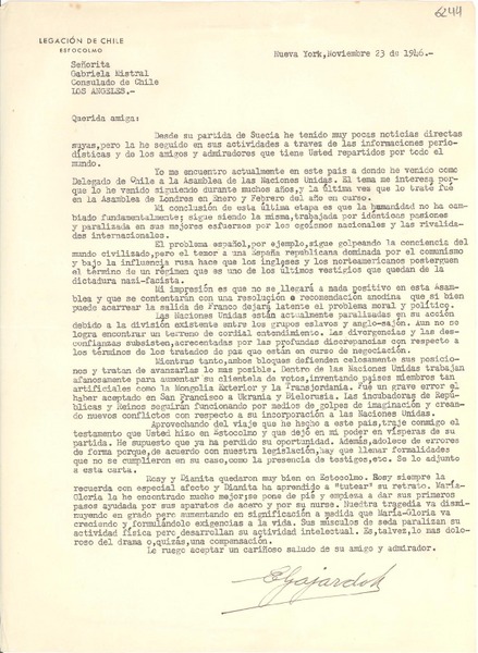 [Carta] 1946 nov. 23, Nueva York [a] Gabriela Mistral, Los Ángeles [manuscrito] E. Gajardo.