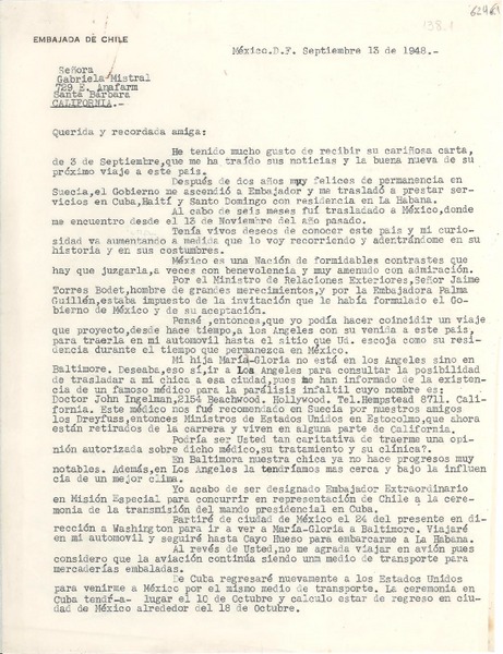 [Carta] 1948 sept. 13, México D. F. [a] Gabriela Mistral, Santa Bárbara, California [manuscrito] Enrique Gajardo V.