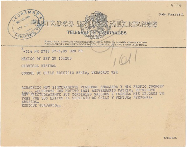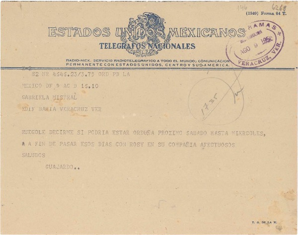 [Telegrama] 1950 ago. 9, México D.F. [a] Gabriela Mistral, Veracruz, [México] [manuscrito] [Enrique] Guajardo [sic] [Villarroel].