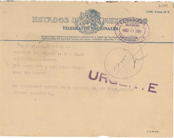 [Telegrama] 1950 ago. 11, México D.F. [a] Gabriela Mistral, Jalapa, [Veracruz, México] [manuscrito] Enrique Guajardo [sic] V.