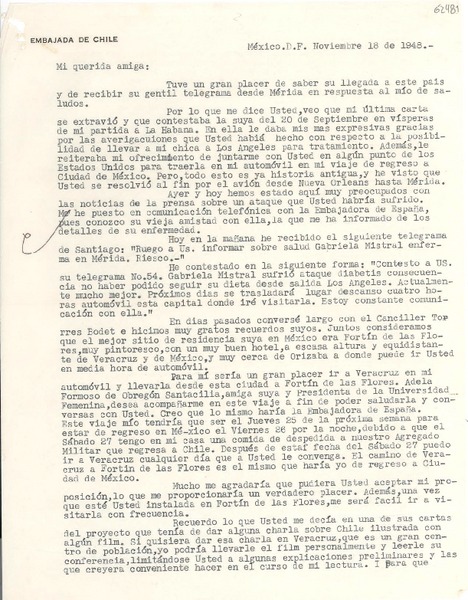 [Carta] 1948 nov. 18, México D. F. [a] Gabriela Mistral [manuscrito] Enrique Gajardo V.