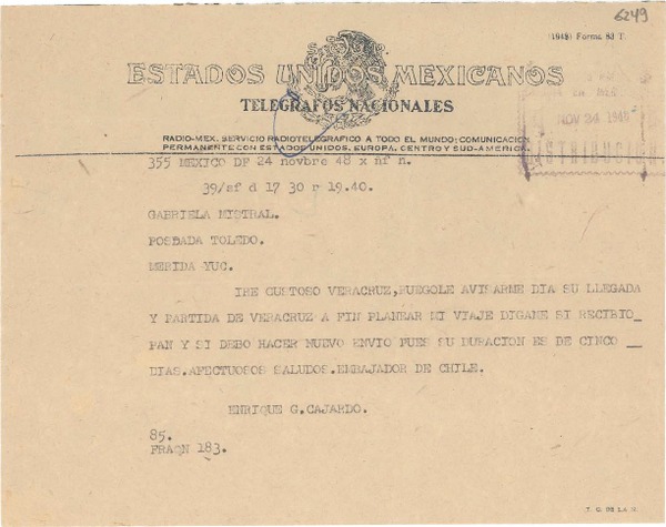 [Telegrama] 1948 nov. 24, México D.F. [a] Gabriela Mistral, Mérida, Yucatán [manuscrito] Enrique Gajardo.