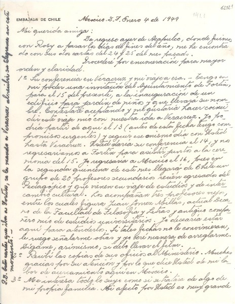 [Carta] 1949 ene. 4, México D. F. [a] Gabriela Mistral [manuscrito] Enrique Gajardo V.