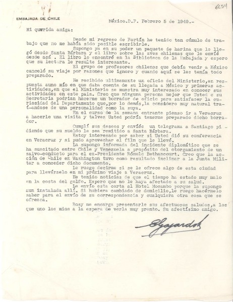 [Carta] 1949 feb. 6, México D. F. [a] Gabriela Mistral [manuscrito] E. Gajardo.