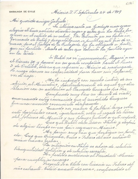 [Carta] 1949 sept. 24, México D.F. [a] Gabriela Mistral [manuscrito] E. Gajardo.