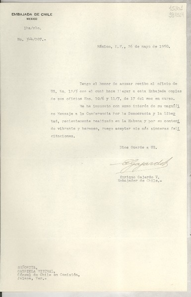 [Oficio] N° 344207, 1950 mayo 26, México D. F. [a] Señorita Gabriela Mistral, Cónsul de Chile en Comisión, Jalapa, Ver. [manuscrito] / Enrique Gajardo V.