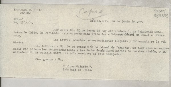 [Oficio] N° 384224, 1950 jun. 24, México D. F. [a] Gabriela Mistral [manuscrito] / Enrique Gajardo V.