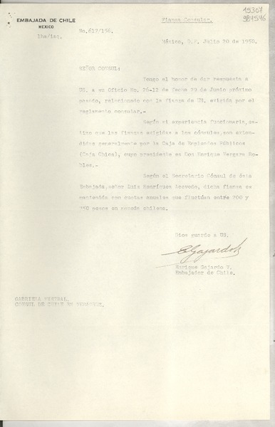 [Oficio] N° 617156, 1950 jul. 20, México D. F. [a] Gabriela Mistral, Cónsul de Chile, Veracruz [manuscrito] / Enrique Gajardo V.