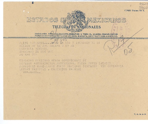 [Telegrama] 1949 jul. 14, México D. F. [a] Gabriela Mistral, Jalapa, Ver. [manuscrito] Enrique Guajardo.