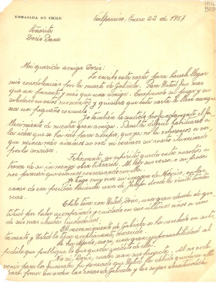 [carta] 1957 ene. 22, Valparaíso, [Chile] [a] Doris Dana [manuscrito] Enrique Gajardo V.