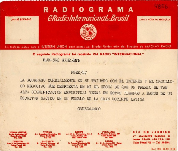 [Carta] [manuscrito] Luis D. Cruz Ocampo.