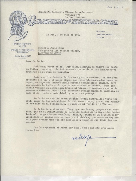 [Carta] 1960 mayo 3, La Paz, Bolivia [a] Doris Dana, Santiago de Chile [manuscrito] Mireya Lara Carrasco.