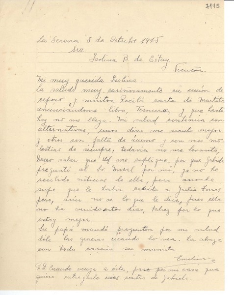[Carta] 1945 oct. 5, La Serena [a] Isolina B. de Estay, Vicuña [manuscrito] Emelina Molina.