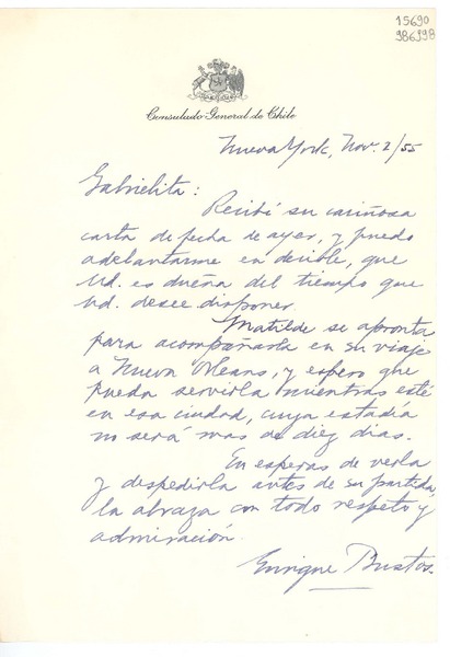 [Carta] 1955 nov. 2, Nueva York, [Estados Unidos] [a] Gabrielita [manuscrito] Enrique Bustos.