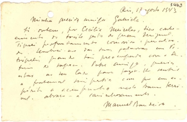 [Carta] 1943 jul. 1, Rio de Janeiro, [Brasil] [a] Gabriela Mistral [manuscrito] Manuel [Bandeira].