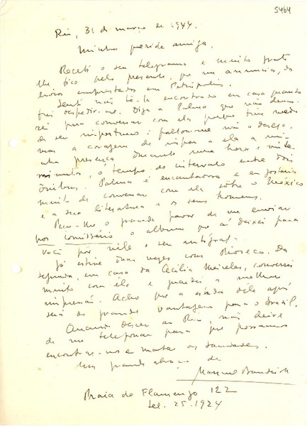[Carta] 1944 março 31, Rio, [Brasil] [a] [Gabriela Mistral] [manuscrito] Manuel Bandeira.