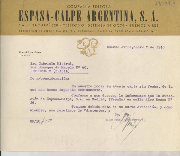 [Carta] 1940 ene. 2, Buenos Aires, Argentina [a] Gabriela Mistral, Petrópolis, Brasil [manuscrito] Compañía Editora Espasa-Calpe Argentina.