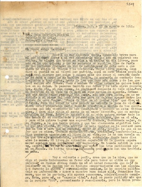 [Carta] 1941 ago. 11, México D.F. [a] Gabriela Mistral, Petrópolis, Brasil [manuscrito] José Bergamín.