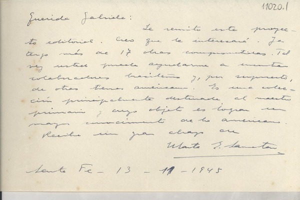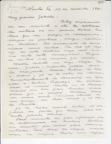 [Carta] 1945 nov. 13, Santa Fe, [Argentina] [a] Gabriela Mistral [manuscrito] Marta Samatan.