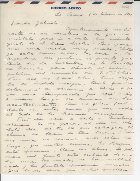[Carta] 1944 feb. 9, La Serena, [Chile] [a] Gabriela [Mistral] [manuscrito] Marta [Samatan].