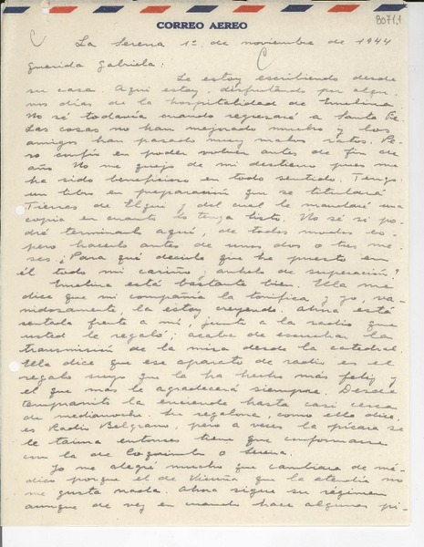 [Carta] 1944 nov. 1, La Serena, [Chile] [a] Gabriela Mistral [manuscrito] Marta [Samatan].