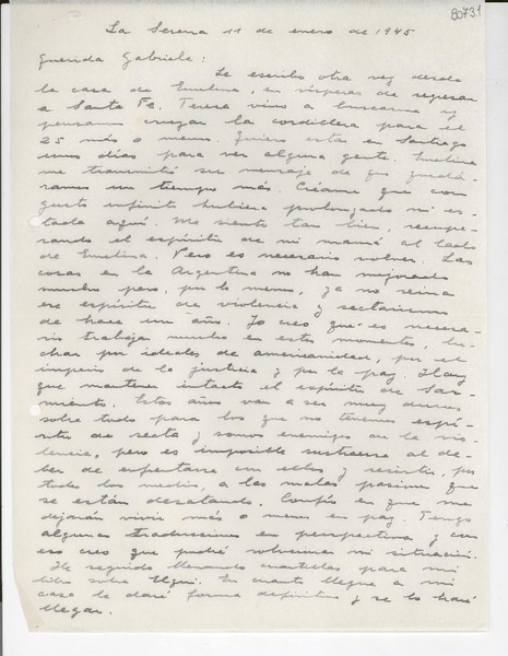 [Carta] 1945 ene. 11, La Serena, [Chile] [a] Gabriela Mistral [manuscrito] Marta [Samatan].