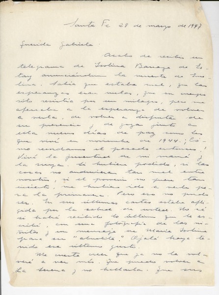 [Carta] 1947 mar. 28, Santa Fe, [Argentina] [a] Gabriela Mistral [manuscrito] Marta Samatan.