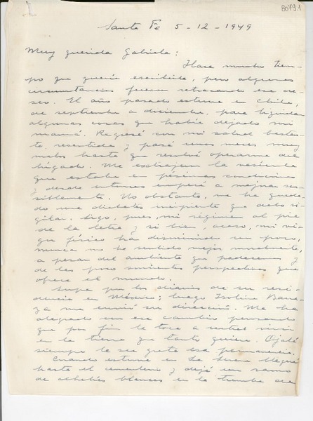 [Carta] 1949 dic. 5, Santa Fe, [Argentina] [a] Gabriela Mistral [manuscrito] Marta [Samatan].