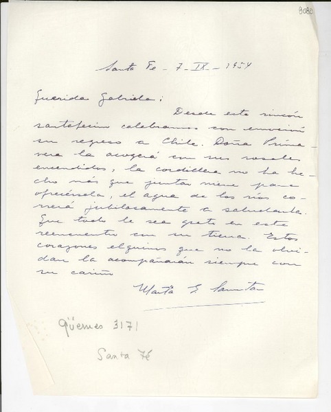 [Carta] 1954 sept. 7, Santa Fe, [Argentina] [a] Gabriela Mistral [manuscrito] Marta Samatan.