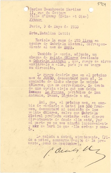 [Carta] 1933 mayo 9, Paris, Francia [a] Natalina [i.e. Natalia] Gatti [manuscrito] Carlos Deambrosis Martins.