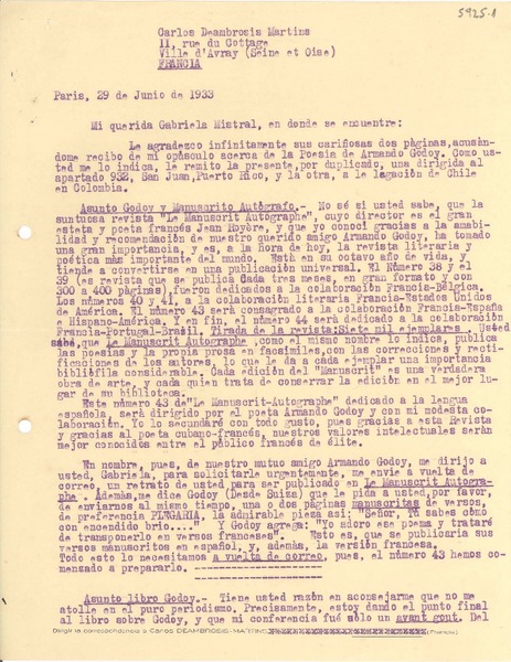 [Carta] 1933 jun. 29, Paris, Francia [a] Gabriela Mistral [manuscrito] Carlos Deambrosis Martins.